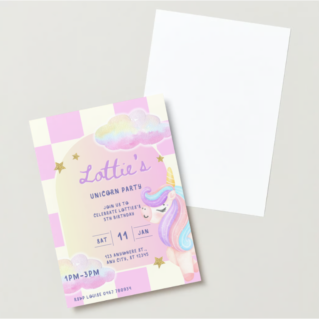 The unicorn theme features a modern design with a vibrant mix of pink, purple, and blue, creating a playful yet magical vibe. Perfect for kids' birthday parties, these personalised invites will have everyone excited for a day full of unicorn enchantment and fun!